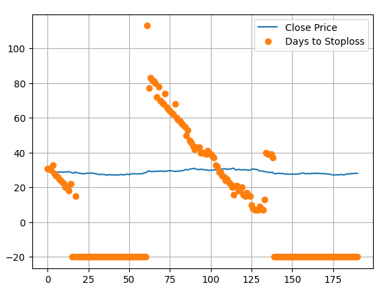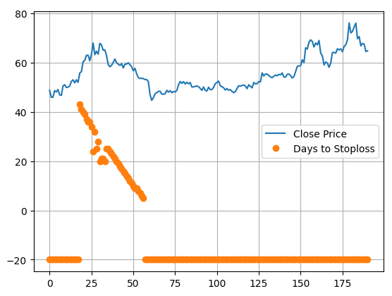 图中的蓝色线显示每日收盘价,橙色点显示该日买入后多长时间触发止损,如果未出发止损,则显示为-20。