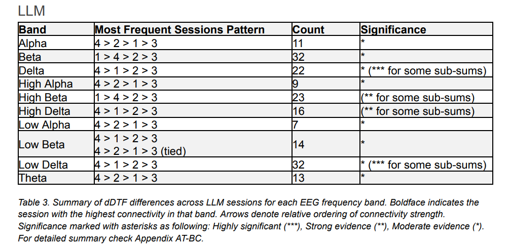 图 -3,揭示了 LLM 组在四次写作过程中,大脑连接模式是如何动态变化的。大脑的“连接强度”在写哪篇论文时最强/最弱。基本都是第 4 次连接最强,第 3 次时最弱。也就是说不用 LLM 的那一次大脑更活跃。Count 记录,如 11 指在全部统计分析中,有 11 条(对)独立的、显著的大脑功能连接,其强度变化遵循了 4 > 2 > 1 > 3 这个排序模式。Significance(显著性):* 通常表示 p<0.05,**p<0.01,***p<0.001)。