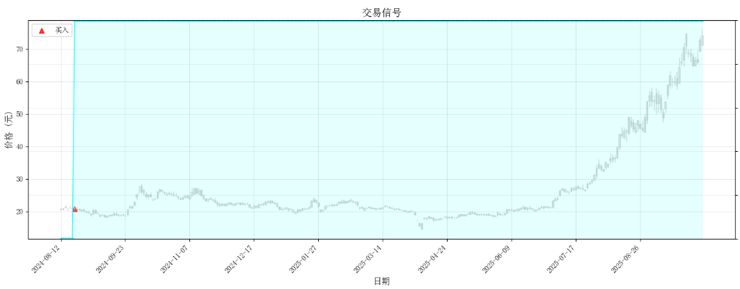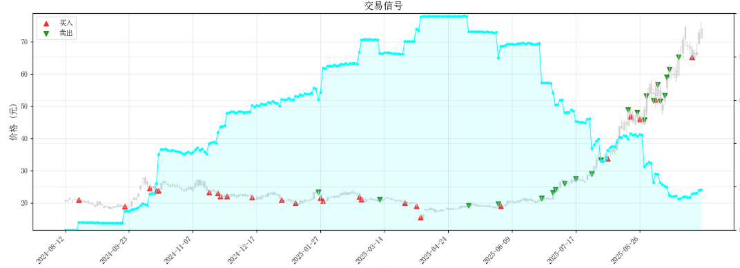 红色是买入点,绿色是卖出点,蓝色是仓位。可以看到从 24 年初我就开始买,在将近一年的横盘微跌中一直加仓;7 月开始涨,我就开始卖,涨了还没三分之一,我已经卖掉大半了——典型卖飞。这种情况下收益是 61%(不计本金)。