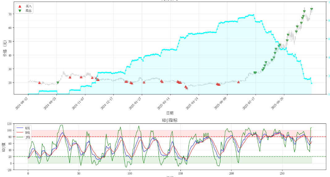 后期一直在涨,K/D/J 线都没有下来过,不会触发买入;而 J 长期处于高位,又会不断触发卖出。又尝试了:用周线减小波动、只在 J 值下穿且之前大于 80 时卖出……但仍逃不过高位震荡时的卖出触发。